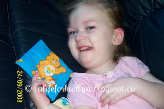 I think that Kaitlyn has finally seen the worst of this cold. We still pulled a bit of chunky stuff out of her today but overall not too bad. She was much more vocal today!! I don't know if this is a good thing or a bad..(just kidding). When she is sick or dealing with increased secretions she gets quiet. She had no trouble hollering at her brothers today to get out of her way while watching TV. They like to stand right in front of the TV set. She is asking to go..go..go.. again, and hollering at Daddy for attention. She was in a really good mood when she got up this morning. Kaitlyn had a good play on the couch this morning with her twin brother Alexander. I've included a couple of pics.