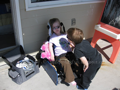 Things have been so quiet around here lately that I haven't had anything to write about. This is a good thing in the world of SMA. Today was a beautiful day out! Sunny and warm. I cannot take all three children out by myself (not with Kaitlyn requiring constant monitoring), but we did all go out on the deck to get some fresh air and sunshine! Kaitlyn and the boys had a blast. The boys antics amused Kaitlyn and she kept saying, "cars...cars...cars". We live in an apartment next to a highway...lots of traffic!