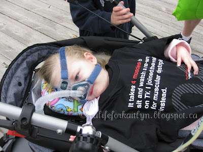 It's nice to be able to show our support to such a wonderful organisation. Kaitlyn's picture was in the 2009 brochure for the Walk this year. It was a lovely honour and we were glad to be able to join them. Tim was able to raise a little money through sponsors for the Walk. Friends of ours donated both monetarily and of their time for the occasion. We were glad for the company! Thanks Dave, Amanda, Ryan and Emily! Tim and I would like to thank everyone else who sponsored our family for the Walk. It means a lot to us to be able to give back a little of the money that has been provided for Kaitlyn by MDA to buy essential medical equipment! As always we are grateful for the support!!
